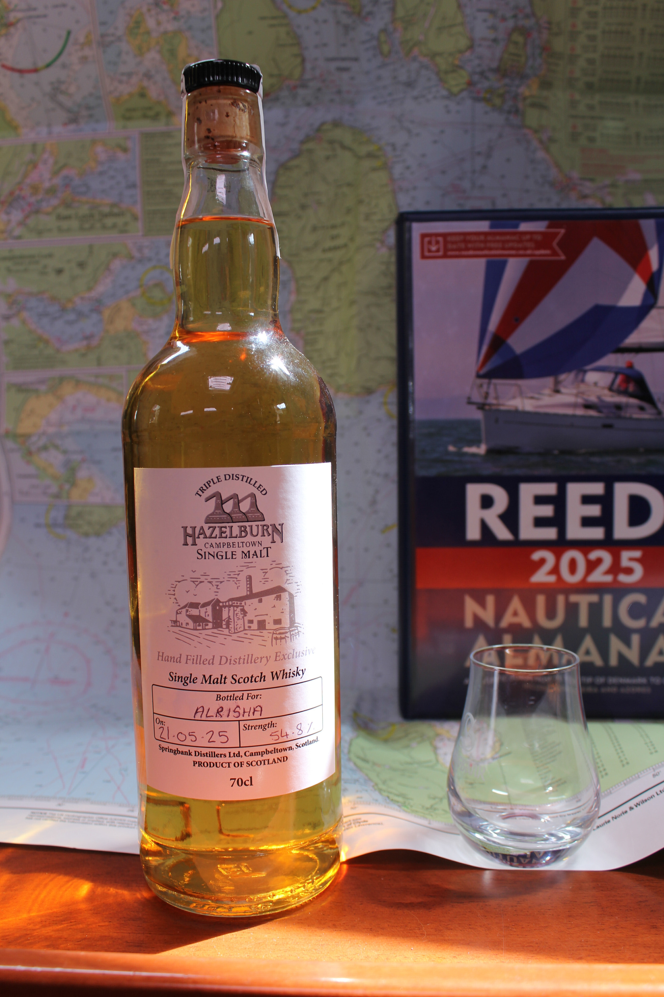 Beim Bild geht es mir um die europäische Seglerbibel schlechthin (ohne Mittelmeer) den "Reeds Nautical Almanach" und nicht den Whisky. Whisky trinken gehört auch nicht zur Ausbildung und während des Segelns halten wir uns strikt an die 0.0 Promille Regel. Aber wieso nicht am Abend, bei einer gemütlichen Planungsrunde für den nächsten Tag...